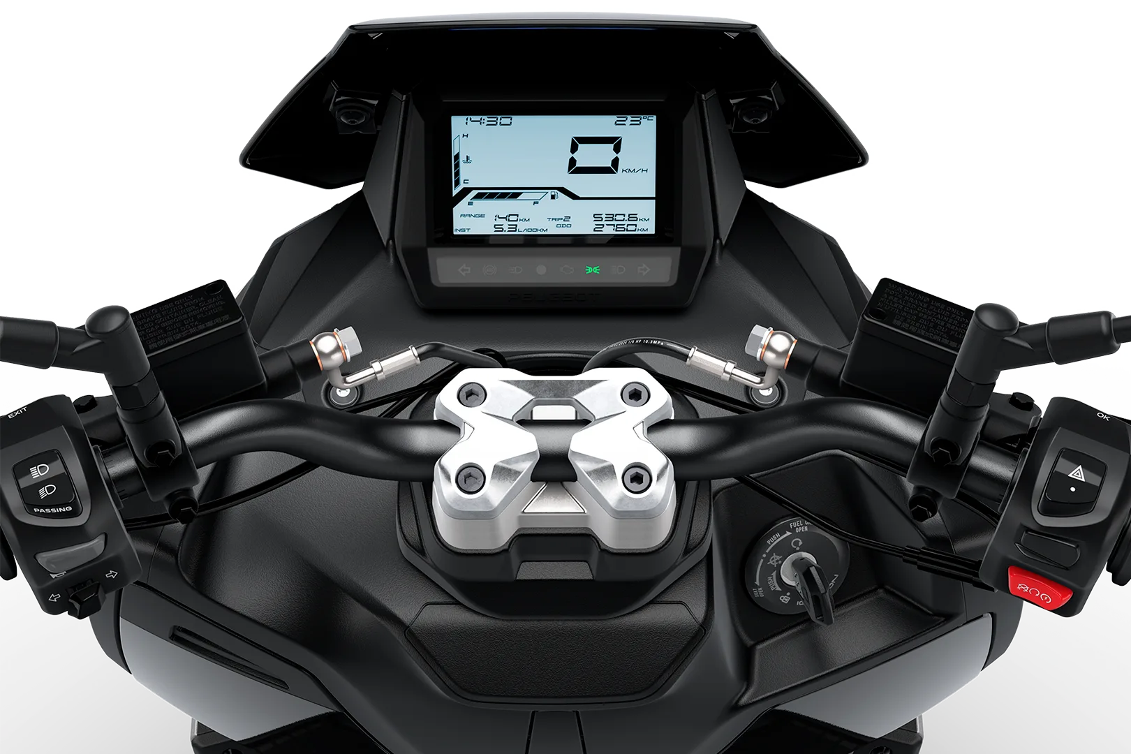 El volumen de almacenamiento bajo el asiento, alcanzando los 45 litros, permite acoger un casco integral y un casco jet o efectos personales sin recurrir a equipamientos adicionales. El depósito de 11,1 litros asegura una autonomía confortable hasta 440 km, limitando paradas frecuentes y facilitando la organización de trayectos, urbanos o periurbanos.